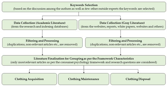 Second, these keywords were used in various databases (including Google Scholar, Web of Science, ScienceDirect, Scopus and other related databases of gray literature). Third, the obtained articles from the keyword search are further filtered and processed to pick the most relevant literature for this study. Additionally, duplication in the articles between the indexed databases was removed. Fourth, the filtered articles were grouped per the consumer psychology framework categories, i.e., clothing acquisition, clothing maintenance, and clothing disposal. Fifth, these articles were studied critically under three groups for addressing the RQ1, RQ2, and RQ3. The detailed steps of the methodological process of the review are shown in Figure 2.