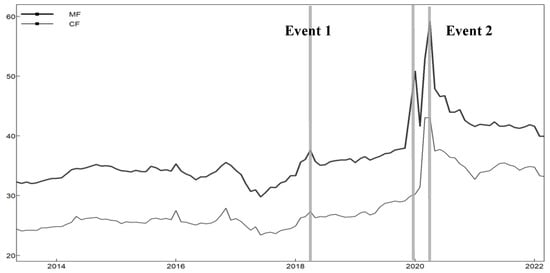In order to meet the requirements of the MF-VAR model and ensure that the ratio of high-frequency commodity market data to low-frequency macroeconomic data is fixed, each month is fixed at 4 weeks in this paper (i.e., the frequency ratio of commodity market data to macroeconomic data m is fixed at 4). The total number of monthly days of high-frequency data is divided by 4 and the division of the excess days is from backward to forward (i.e., if there are 23 trading days in the month, the number of trading days in the 4 weeks of the month is 5, 6, 6, and 6 days, respectively). At the same time, this paper further converts the CFCI commodity index into weekly and monthly annualized volatility with the log return using the method of Paye et al. (2012) [40] after taking it to the log return. For the annualized realized volatility for week j of month t  σ t , j = 48 i W j r i 2 ( t , j ) , W j denotes the number of trading days in week j and the annualized realized volatility for month t σ ˜ t = 1 2 i M t r i 2 ( t , j ) , M t is the number of trading days in month t. For comparability, the CPI-based index is used to construct a fixed price index for macro variables, which is seasonally adjusted by the X11 method.