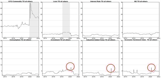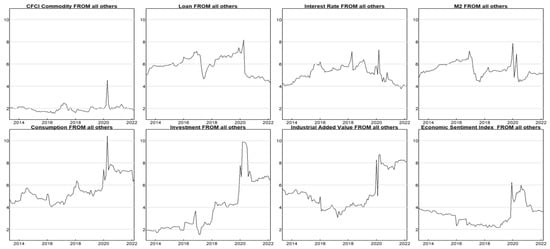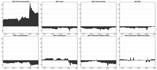 Figure 3 shows the dynamics of the total volatility spillover received by the CFCI commodity and macroeconomic sectors from all other sectors (corresponding to the “FROM” row in Table 1). It can be seen that the volatility spillover from external sources increased in early 2020, among which loans, interest rates, and M2 have fallen back significantly in the later period and the total volatility spillovers are lower than the original level; however, consumption, investment, industrial added value, and economic sentiment index have increased more and fallen back less in the later period, with the average value increasing by 1.88, 2.87, 3.04, and 1.53, respectively, compared with 2019. Next, we document the results of the dynamics of the net volatility spillover of the CFCI commodity and macroeconomic sectors in the selected sample interval in Figure 4.