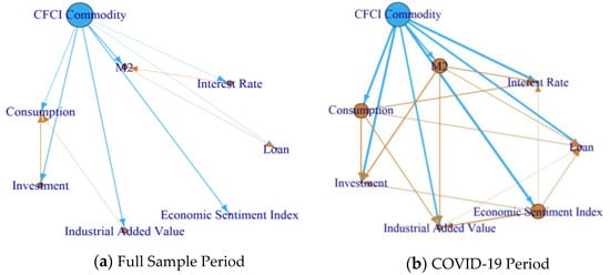 Figure 5a shows that the volatility spillover network is sparse; the blue and orange lines are thin in the full sample period, while the volatility spillover network lines are significantly larger and thicker during the COVID-19 period, as seen in Figure 5b, indicating that the risk contagion effect from the commodity markets to the macroeconomic sectors and within the macroeconomic sectors increased significantly since the outbreak of the COVID-19 pandemic. The blue node for the CFCI commodity is the largest in both the full sample and the pandemic period and is the main exporter of risk. Among all the orange nodes in Figure 5b, M2, consumption, and the economic sentiment index have larger nodes and lines pointing to multiple markets such as investment, consumption, and industrial added value, indicating that M2, consumption, and the economic sentiment index are the main sources of risk contagion within the macroeconomy during the pandemic.