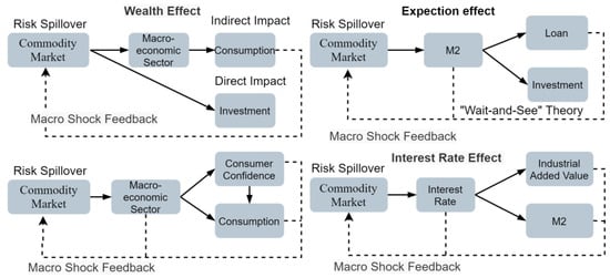 In financial markets that deal with stocks and bonds, there is a two-way risk spillover relationship between the commodity markets and the macroeconomy. The imbalance between supply and demand caused by economic growth and lack of liquidity levels can push commodities prices [24,25]. Macro variables such as interest rates, exchange rates, monetary policy, and price levels can effectively explain the commodities’ price volatility and predict price movement [26,27,28]. Studies on the impact of commodities prices on macroeconomic fluctuations tend to focus on the impact of some international commodities prices, such as oil prices. Studies have shown that commodities price fluctuations, as an external price shock, can have an inverse impact on macro factors [29,30,31,32]. Therefore, commodities prices can be used as an early indicator of economic performance for macroeconomic monitoring.