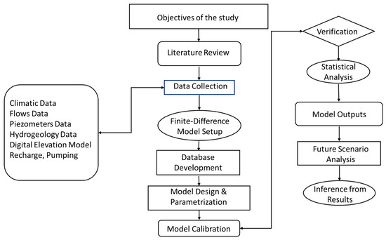 Computer simulation models are used extensively nowadays for natural resource management around the globe [27]. Likewise, numerical models can also provide good insight into water resource management problems [28]. Groundwater models represent natural systems in the simplest way [29], and if they are developed appropriately, they can be used as a very effective tool for managing groundwater resources [30]. In modern hydrogeology, numerical groundwater models can be used as a critical component to serve many purposes, e.g., for testing any particular hypothesis, projecting the system’s future behaviour, or simply managing the hydrological data in a conceptual framework [31]. For the management of groundwater resources, sometimes critical decisions are required that need the analysis of the system; numerical groundwater models are an essential component for such an exercise [32]. The direct observation of complex aquifer systems is often not practicable [33]; hence, to support the decision-makers in serving a specific purpose, models provide insights through the simulation process [34]. Numerical models use different governing equations to naturally represent various physical processes that occur in the groundwater system, and they also represent the model’s heads, fluxes, and boundaries [35].
