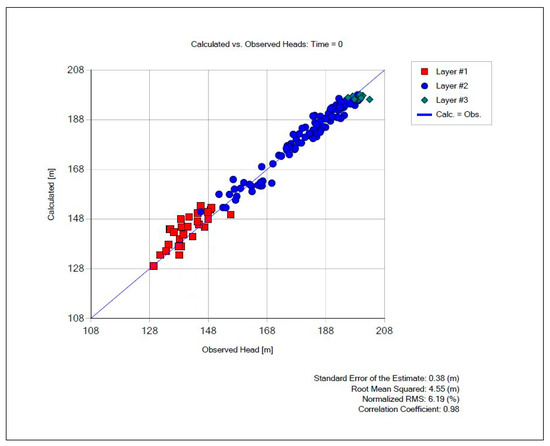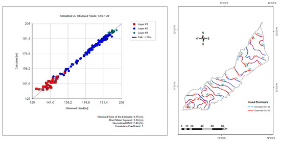 The steady-state model was calibrated manually during the first phase, and groundwater head values (pre-monsoon) for 2006 were used for this purpose. The scatter plot representing measured and modelled head values for the year 2006 is given in Figure 4. The hydraulic conductivity values of the upper and lower aquifers were varied repeatedly so that the difference between the observed and simulated head values would be minimized. The process was continued so that the root mean square error (RMSE) would be kept below 5 m. The value of the correlation coefficient was observed as being 0.98 for the steady-state calibrations, which helps the modeller to understand the model system better; resultantly, the model failure chances were reduced [57]. The manual calibration process is not easy and consumes a lot of time. Still, it helps to minimize the convergence time in the automated calibration process, and it also allows the modeller to understand the model system better, and resultantly, the model failure chances are reduced [58].