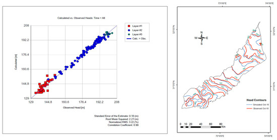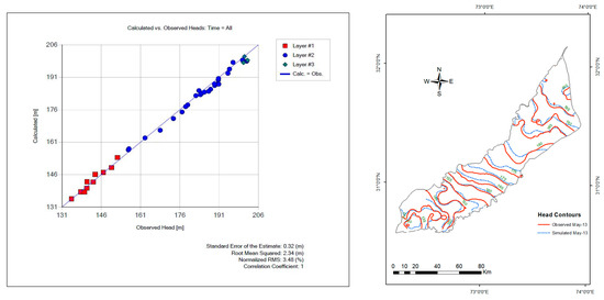 The model was validated with the data from 2011–2013. The data obtained from the model simulation and observation wells showed a satisfactory correlation, and goodness-of-fit was achieved. Figure 7 shows the observed and simulated head contours and scatter plot for 2013. The validation of the model results for 2011–2013 showed that the model performed reasonably well, as the SEE and RMSE were 0.32 and 2.3 m, whereas the correlation coefficient was 1 (Table 2 and Table 3). Overall, the model performance was satisfactory as most of the points lay close to the 1:1 line, with some points showing variations that may be due to the initial parameters’ setting values, or the boundary conditions of the river and link canals may be the potential cause of this drift. Nevertheless, the model showed reasonable results overall for its adoption for future simulation processes.