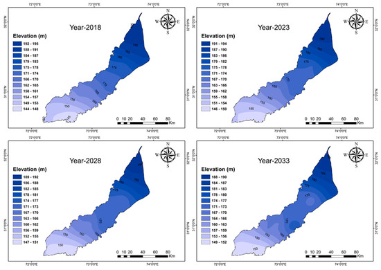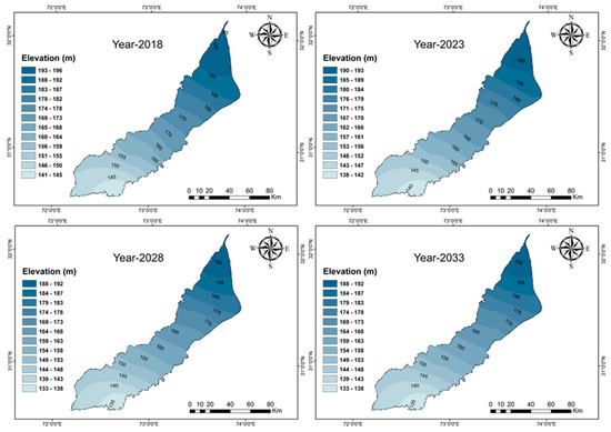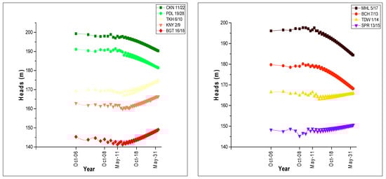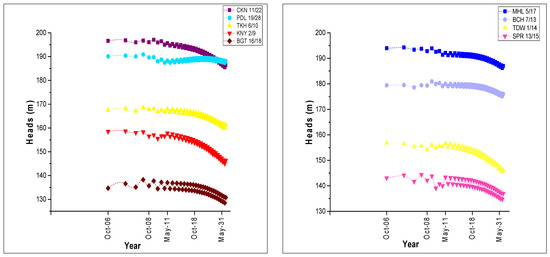 Under the business-as-usual scenario, it was assumed that all the conditions of recharge and pumping would remain unchanged from the initial simulation date, and the hydrodynamics of the aquifer system were observed until 2033.