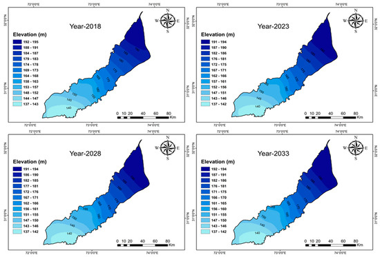 Considering the study area’s recharge and pumping patterns, a new water management scenario was developed. The recharge from irrigation water in the upper parts of the study area was shifted to the lower regions, thereby decreasing the pumping rate at the lower sites. The study area is comprised of nine subdivisions. The upper part of the study area consists of four subdivisions, i.e., CKN (Chuharkana), MHL (Mohlan), PDL (Paccadala) and BCH (Buchiana), whereas the lower part includes the TDW (Tandlianwala), TKH (Tarkhani), KNY (Kanya), BGT (Bhagat), and SPR (Sultanpur) subdivisions. The recharge rate in the upper subdivisions was reduced by 30%, and it was increased by 30% in the lower portions; conversely, the pumping was increased by 30% in the upper part and reduced by 30% in the lower subdivisions.