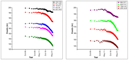 During the last 4 decades, this has not only caused groundwater levels to decline, but the lateral movement of saline groundwater from adjoining areas has also deteriorated the quality of fresh groundwater in many regions of the Indus Plain [23]. Thus, the sustainable management of groundwater will be a more severe and challenging issue for the country in times to come, contrary to groundwater development [24]. It has been estimated that in the entire Punjab Province of Pakistan, during the post-SCARPS period, the groundwater table decreased by 5–7 m on average, whereas more than 50% of the irrigated area of the province had a 6 m drop [11], and this declining trend continues at a rapid pace in most of the areas where groundwater is excessively pumped [25,26].