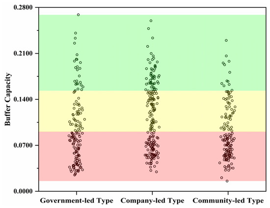 In descending order, the farmer households’ buffer capacity under different tourism development management modes is as follows: company-led (0.1146), government-led (0.0963), and community-led (0.0913) (Figure 2)—all of which correspond to the middle level. There is a significant internal difference concerning the farmer households’ buffer capacity across the three modes, which is graded as low, medium, and high. Government-led and community-led farmer households are mostly of the middle and low grades, whereas company-led farmer households are mostly of the middle and high grades; thus, company-led farmer households have a higher buffer capacity than the other two types.