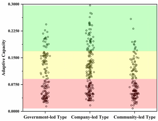 Under different tourism development management modes, the adaptive capacity of the farmer households in descending order is as follows: company-led (0.1169), government-led (0.1004), and community-led (0.0854) (Figure 2). Among them, the adaptive capacity indices of the company-led and government-led farmer households are evenly distributed in three grades, and their average value is intermediate; however, the community-led households are dominated by middle and low grades, and exhibit a low-value aggregation trend, so the average value of its adaptive capacity index is low (Figure 4).