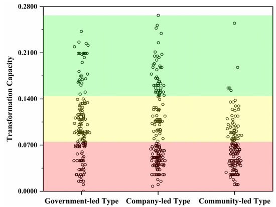 Under different tourism development management modes, the transformation capacity of farmer households in descending order is as follows: government-led (0.1018), company-led (0.0935), and community-led (0.0674) (Figure 2). Among them, the transformation capacity indices of the government-led and company-led farmer households have a large number distribution in three grades, and the average values were all intermediate, but the company-led households show a partial low-value focusing trend, resulting in their average value being slightly lower than that of the government-led households; however, the community-led households are dominated by middle and low grades, and show a low-value aggregation trend, so the average value of their transformation capacity index is low (Figure 5).