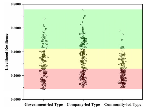 Under different modes of tourism development management, the order of farmer households’ livelihood resilience is as follows: company-led (0.3250), government-led (0.2984), and community-led (0.2442) (Figure 2). Among them, the livelihood resilience index of company-led and government-led farmer households is basically distributed in three grades, and the average value is medium, with no significant difference between them; however, the community-led households mainly corresponded to middle and low grades, and these households show a low-value aggregation trend, so their average livelihood resilience index is low—significantly lower than the other two types (Figure 6).
