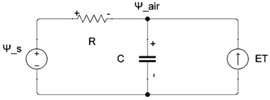 The hydraulic system can be represented by the analogy of Ohm’s law and it is used to determine the transpiration of trees or meteorological conditions such as the potential of water in the air [50]. Detailed explanations can be found in the works of Tyree and Ewers [42] and Kumagai [43]. Figure 2 shows a representative scheme of the analogy, including the potential of water in the air () and the ground (), the evapotranspiration (ET), the hydric resistance (R), and the water storage (C) equivalents of the system.