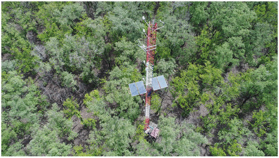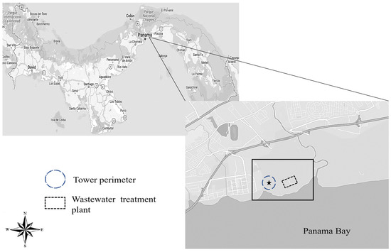 The experimental site (9°00′51.82″ N 79°27′10.60″ W) is located in a mangrove forest in the Bay of Panama (Figure 3), within the Juan Díaz neighborhood with an average temperature of 27 °C per year. Among the species that can be found close to the study area are Rhizophora mangle, Laguncularia racemosa, Avicennia germinans, and Avicennia bicolor, the last two species being present in the study area [53]. This area was selected due to the presence of a 30.3 m flow measurement tower (Figure 4) with multiple sensors (Table 1), with a radius of action of 300 m, to record meteorological variables such as wind speed and direction, temperature, CO2, and water vapor concentrations.