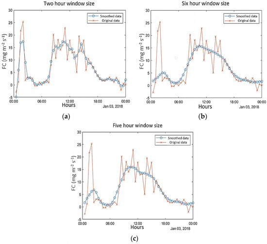 (a) Data smoothing using reference data every two hours (data window); (b) Data smoothing using reference data every six hours; (c) Data smoothing using reference data every five hours. Own elaboration.