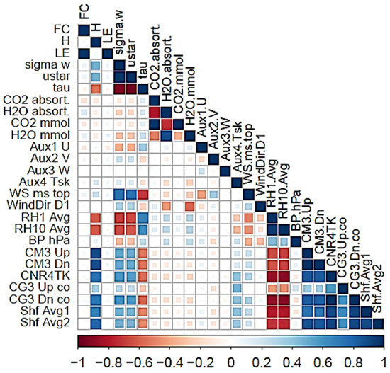 The Pearson correlation analysis performed using the variables recorded in the field of study served to identify which of these have a significant influence on the behavior of the energy flows analyzed. The variables considered for the analysis were: FC, H, LE, WS_ms_top_Avg, WindDir_D1_WVT, RH10_Avg and RH1_Avg, sonic temperature (Aux 4—Ts), wind speeds in its different components (U, V, and W), CO2, and H2O absorptance, the record of CO2 and H2O in mmol, barometric pressure (BP_hPa), average air temperature (CMR4TK), incoming and reflected shortwave radiation (CM3_Up and CM3_Dn), descending and ascending longwave radiation (CG3_Up_co and CG3_Dn_co), ground heat fluxes (Shf_Avg1 and Shf_Avg2), vertical velocity standard deviation (Sigma_w), friction velocity (ustar), and momentum (Tau).