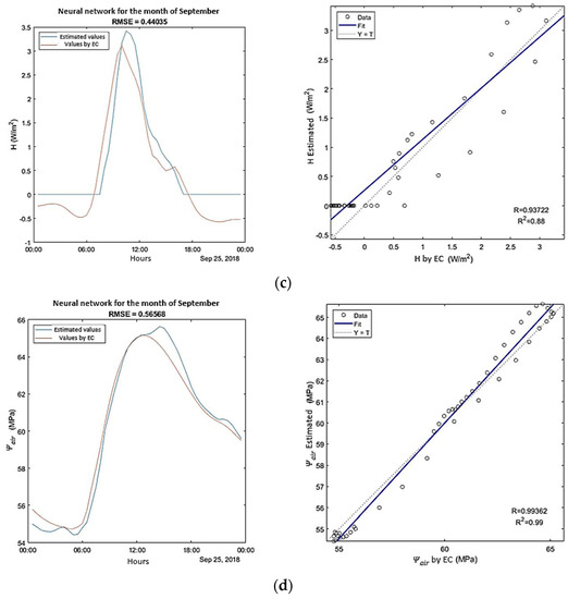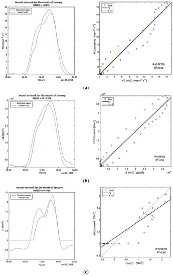 - Black Box Model: A black box model was applied and developed through the application of neural networks using the Deep Learning package of MATLAB software. The use of neural networks for the prediction of energy flows (LE, H, FC) was highly effective, obtaining R2 values greater than 0.86 in the runs carried out in January and September 2018.
