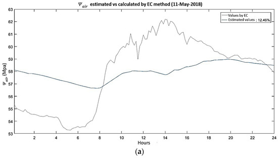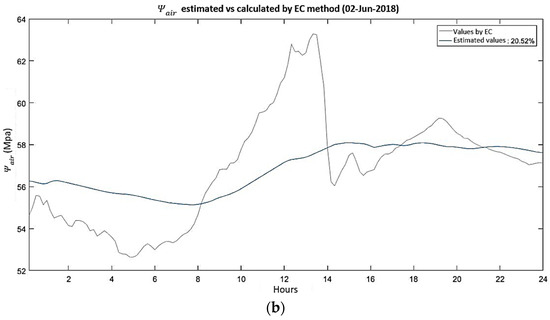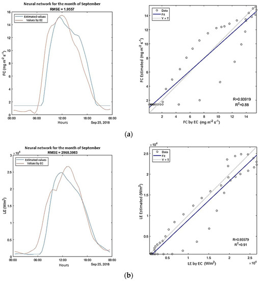 Once the model determines the configuration of R, C, and G that minimizes the estimation error value (Table 6), the data are used for the validation process, estimating the value for 11 May and 2 June (days that did not belong to the training group), comparing it with obtained by the EC method. The training process of this model generated an estimation error value of 13.46% after 4774 iterations. The results obtained in the validation of 11 May (Figure 11a) show an R2 coefficient of 0.37, while for 2 June (Figure 11b) an R2 coefficient of 0.43 was obtained, both representing a very low ability to predict the behavior of .