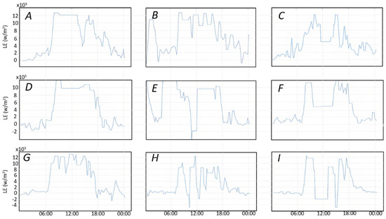 Behaviors observed in LE data from 00:10 to 23:50. The variability recorded by the sensors can be observed, with surpluses shown in (E), (B) and (C), absence of data for (F), (H) and (I), as well as an expected behavior for (A), (D) and (G). Own elaboration.