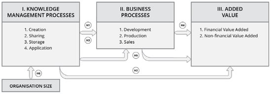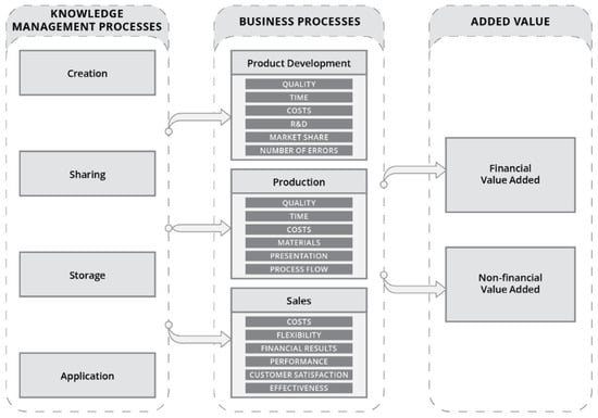 Knowledge management (KM) practice is increasingly less considered as a supportive activity, as knowledge management processes (KMP) are inseparable from critical business processes (BP). Even though some scientific studies underlined that KM integration into BP are expensive and slow due to many organizational barriers, their sustainable value to organizations is undeniable. Although KMPs’ interactions have been studied in the scientific literature, there is still a lack of comprehensive studies related to knowledge-intensive organizations’ practices on the impact of the whole KM cycle—consisting of knowledge creation, sharing, storage, and application—on BP, such as development, production, and sales, for creating value-added (VA) and sustainability. In order to identify interconnections between individual KMP and BP, this study aimed to evaluate the influence of KMP on BP to support the continuous improvement of BP and the creation of VA in knowledge-intensive organizations. A research model was developed to analyze the impact of KMP on BP and VA perspectives. An empirical study was performed in Lithuanian project management companies that used BP in their operations and involved 144 managers from 72 IT organizations. Survey (structured questionnaire) and statistical analysis methods (one-way analysis of variance (ANOVA); Pearson’s correlation analysis; multiple regression analysis and mediation analysis; cluster analysis and chi-square analysis) were applied in this study. The research results confirmed that every KMP positively affected individual BP, where knowledge creation had the most significant impact. The hypothesis that every KMP positively affected the VA created in an organization was partially confirmed since knowledge sharing and creation had a strong influence. The study demonstrated that KMP as a whole had a positive effect on the central BP, change (improvement) of BP increased VA created in organizations, and BP acted as a mediator of the positive correlation between KMP and the VA. The effectiveness of individual KMP depended on the size of the organization. As a result, the study confirmed that KMP in organizations could not be performed separately and had to be integrated into BP to maximize the VA. The significance of the research model lay not only in its ability to identify the influence of KMP on the VA created in organizations but also in evaluating each KMP individually.