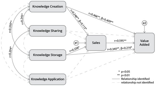 Many proposed research models were linked to the relationship between KM and VA. However, these models were not oriented to identify the influence of KMP on BP, their optimization and re-engineering, and the VA created in the organization. Brunswicker and Vanhaverbeke’s study explored enterprises engaged in external knowledge sourcing, a form of open inbound innovation. The study indicated that external knowledge sourcing is sensible for enterprises. It offers performance benefits and can improve innovation performance in two dimensions: the success of launching innovation and the appropriation of financial value from new products and services [74].