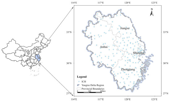 The data for national ICH in the Yangtze Delta region were obtained from the official website of China’s ICH (http://www.Ihchina.cn, accessed on 15 July 2022), and included the names, categories, locations, and years of publication. Based on the Google Earth coordinate system, we further determined the latitude and longitude information of ICH, connected the locations of ICH with the relevant attribute data, and established a geographic information database for national ICH in Yangtze Delta region.