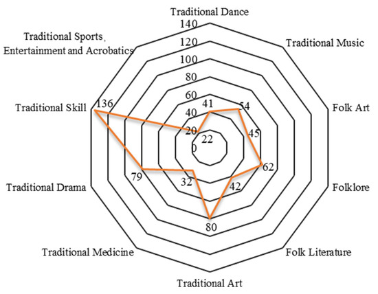 There are 593 items of national ICH in the Yangtze Delta region, divided into 10 categories in total. Among them, 41 are traditional dances, 54 traditional music, 45 folk arts, 62 folklore, 42 folk literature, 80 traditional arts, 32 traditional medicine, 79 traditional drama, 136 traditional skills, and 22 traditional sports, entertainment, or acrobatics (Figure 2).