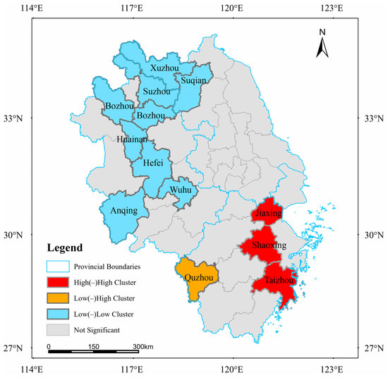 The local aggregation characteristics of national ICH in the Yangtze Delta region were further investigated, and the clustering patterns were calculated through local spatial autocorrelation analysis of local clusters and outliers. Figure 3 reveals the obvious spatial divergence characteristics of national ICH in the Yangtze Delta region, showing the high–high clustering areas mainly distributed in Jiaxing, Shaoxing, Taizhou and other cities in Zhejiang Province, from which it can be concluded that ICH is generally distributed in larger quantities and more uniformly in Zhejiang Province, southern Jiangsu Province, and Shanghai. The low–high clustering areas are distributed in Quzhou City in Zhejiang Province. The low–low clustering areas are mainly concentrated in Anhui Province, including Suizhou, Bozhou, and Bengbu in the north, and Huainan, Hefei, Anqing in the south-central part, as well as Xuzhou and Suqian in the northern part of Jiangsu, indicating that ICH is generally distributed in smaller quantities in Anhui Province and the northern part of Jiangsu Province.
