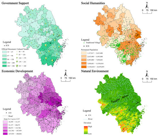 We then superimposed the spatial locations of national ICH in the Yangtze Delta region with different elements (Figure 5). First, by overlaying the government support element, it was found that the development of ICH is inseparable from the support of local governments, and the presence of cultural venues positively correlates with the number of official documents issued on ICH, with the more official documents being issued, the greater the presence of ICH in a city. Secondly, by superimposing the social humanities element, it was revealed that ICH is mainly distributed in cities with large populations of permanent residents, with more than 60% of ICH in cities with a permanent population of more than 5 million. In the Yangtze Delta region, traditional villages are mainly located in the south, and represent an important carrier for the inheritance and development of ICH.