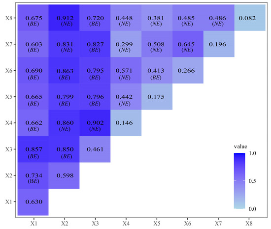 The results of the interaction analysis of influencing factors are shown in Figure 6, revealing nonlinear enhancement (NE) and bi-factor enhancement (BE): the interaction type of Official Document (x1) with River (x8) was NE, and the type with other factors was BE. The interaction of Culture Construction (x2) with Cultural Resource (x4), Altitude (x7), and River (x8) was NE type, and with other factors BE. Permanent Population (x3) interacted with Cultural Resource (x4) in an NE manner, and with other factors in BE. Cultural Resource (x4) interacted with Official Document (x1) in a BE manner, and with other factors in NE. The interaction of Transportation Conditions (x5) with Cultural Resource (x4), Altitude (x7), and River (x8) was NE type, and with other factors BE. The interaction of GDP Per Capita (x6) with Cultural Resource (x4), Altitude (x7), and River (x8) was NE type, and with other factors was BE. The interaction of Altitude (x7) with Official Document (x1) and Permanent Population (x3) was BE type, and with other factors NE. The interaction of River (x8) with Permanent Population (x3) was BE type, and with other factors NE.