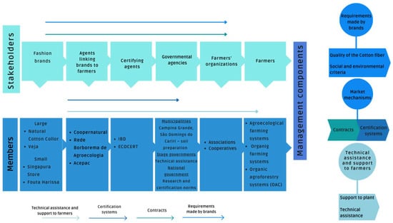 When produced without intercropping with other plants, organic cotton is considered a monoculture by brands that require the use of cotton produced in regenerative systems. Cotton production in agroforestry systems, which is based on simple techniques such as soil cover and plant intercropping, generates complex systems and services such as carbon sequestration and regulation of the local microclimate [18,21]. The production of organic cotton in agroforestry systems meets the demands of brands that have an awareness of the environmental services that are provided by agroforestry systems [22]. Besides sustainable cotton production in the field, market demands for OAC also require sustainable practices throughout the supply chain [16]. Consumers are willing to pay a premium price for sustainability efforts by the whole supply chain, including brands, middlemen, and farmers [23]. This may lead to new methods of supply chain management that differ from the conventional cotton supply chain in terms of efforts to establish fair trade with farmers and mechanisms for certification and traceability [24,25].