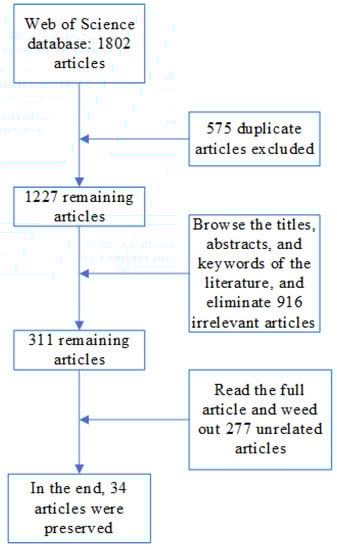 Based on a literature search and expert feedback, in this section, we identify and determine the main factors that influence Chinese highway construction companies to adopt smart construction technologies. We conducted the literature search in May 2022, and we selected the Web of Science database. We did not set a time limit, as research related to smart construction technologies and their adoption is an emerging topic. The searched keywords included “Smart build and adopt”, “Smart build and Influencing factors”, “Willingness to adopt smart building technologies“, and “Build and adopt”. To improve the quality of the study and identify all possible factors influencing highway construction companies’ decisions to adopt intelligent building technology, this paper sets up a filter such that only English journal literature is retained. The preliminary search of Web of Science totaled 1802 articles, and we then eliminated 575 duplicates; browsed the title, abstract, and keywords of the literature to remove 916 irrelevant studies; eliminated 277 studies through full-text reading; and finally screened and retained 34 studies on the possible driving factors for the adoption of intelligent construction technology by expressway construction enterprises in China. The process is shown in Figure 1. The identified influencing factors are shown in Table 1.