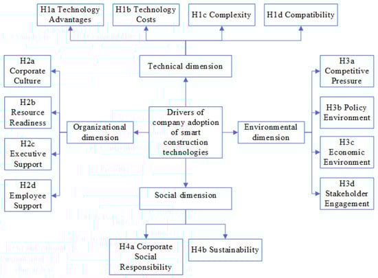 Combined with the influencing factors in Table 1, the authors discussed with 25 experts and scholars on “Drivers of Highway Construction Companies Adopting Smart Construction Technology”. Finally, three influencing factors were removed, and 14 driving factors were retained and divided into four dimensions for analysis and hypothesizing.