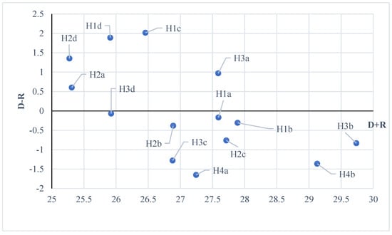 - Positive D-C values for complexity (H1c), compatibility (H1d), employee support (H2d), competitive market pressure (H3a), and corporate culture (H2a) indicate that these factors are causal factors, that they have an active influence on companies’ adoption of smart construction technologies, and that they are less influenced by other factors. Stakeholder involvement (H3d), technological advantage (H1a), technology cost (H1b), resource readiness (H2b), senior management support (H2c), policy environment (H3b), economic environment (H3c), sustainability (H4b), and corporate social responsibility (H4a) have negative D-C values, meaning that they are outcome factors that are influenced by other factors and thus drive the adoption of smart building technologies.