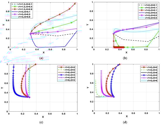 Figure 2c,d show the evolutionary process when the consumer has a boycott sentiment and the manufacturer is pessimistic. As shown in Figure 2c, there is a threshold—r2* satisfying 2 < r2* < 3—when the manufacturer is in a pessimistic state. When r2 > r2*, with the deepening of the boycott sentiment, the consumer is willing to pay more for green products to improve their utility. The reason is that manufacturers tend to overestimate risk in the whole environment when they have higher pessimism sentiments. They may make green technology innovations. At the same time, the demand for green products may be satisfied so that the consumers will choose to purchase green products. As shown in Figure 2d, when r1 = 2 and the pessimistic intensity of the manufacturer increases, the evolutionary stability strategy changes from (0.39, 1) to (0.02, 0.3). This indicates that the more pessimistic the manufacturer is, the more detrimental it is to the formation of a better result. This means that the highly pessimistic manufacturer is more likely to maintain the status quo, and the consumer will choose to buy ordinary products, which is not conducive to green transformation. Because the manufacturer will overestimate the loss and risk of innovation, they may not be willing to make a green technology innovation.