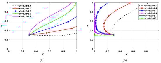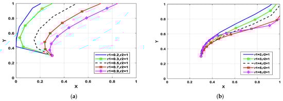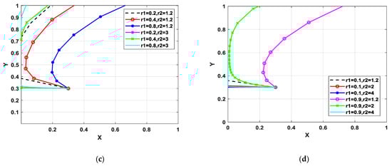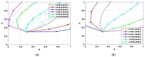 Figure 2 shows how sentiment affects the participants’ decision-making when the consumer has a boycott sentiment. Figure 2a,b show the evolutionary trace when the consumer has boycott sentiments and the manufacturer has optimism sentiments. It can be seen from Figure 2a that when r2 transforms from 0.9 to 0.1, the probability of green technology innovation decreases. The reason is that the more optimistic the manufacturer is, the more likely they underestimate the risks of green product shortage. Thus, the optimistic manufacturer may not choose a green technology innovation strategy. Figure 2b shows that when r2 = 0.1, and r1 transforms from 2 to 5, the probability of the manufacturer adopting a green technology innovation strategy first increases and then decreases. When the manufacturer has a slightly optimistic sentiment (r2 = 0.6), the deepening of the consumer’s sentiment will create a barrier to green technology innovation because, as the boycott sentiment increases, it is hard to achieve the consumer’s demands. The economic benefits of upgrading technology hardly make up for the increased costs at this point, but the high-optimism manufacturer is willing to make efforts to improve its business reputation through green technology innovation at first. However, when boycott sentiments are high, manufacturers tend to eventually maintain the status quo due to expensive costs.