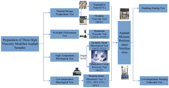 The bending test of the asphalt mixture was performed in accordance with JTG E20-2011 “Asphalt and Asphalt Mixture Test Regulations for Highway Engineering” T0715 [26]. The trabecular specimens were first incubated for 5 h in a −10 °C incubator, then tested at the same temperature at a loading rate of 50 mm/min. The test flow chart is shown in Figure 1