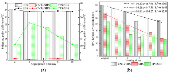 The asphalt segregation test was performed according to ASTM D 5–D 5976, and the samples from the upper and lower parts of the segregation tube were selected for a softening point test. The three kinds of asphalt were heated once every 24 h to measure their dynamic viscosity at 60 °C. The dynamic viscosity test was performed according to ASTM D 2170.