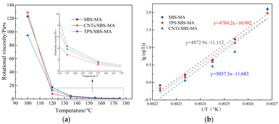 Figure 3a plots the viscosity–temperature relationship curves of the three asphalts. With increasing test temperature, the viscosity of the three asphalts gradually decreased, and the decreasing rate gradually decreased. Among the three asphalt materials, at a test temperature of approximately 100 °C, the asphalt viscosities decreased as follows: CNT/SBS-HVMA > SBS-HVMA > TPS/SBS-HVMA. At a test temperature of approximately 120 °C, the viscosities decreased as follows: SBS-HVMA > TPS/SBS-HVMA > CNT/SBS-HVMA, indicating that the viscosity of CNT/SBS-HVMA was higher at a lower temperature in the range of 100 °C–120 °C for the three kinds of high-viscosity asphalt. This trend extended to a lower temperature and was consistent with the kinematic viscosity at 60 °C, indicating that the asphalt had a higher high-temperature rutting resistance. At a test temperature between 120 °C and 175 °C, the viscosity of the three asphalts gradually decreased with increasing temperature, and the size relationship was consistent. The workability of the bituminous materials was evaluated at a viscosity of 135 °C in accordance with the Strategic Highway Research Program specification. Figure 3a shows that at a test temperature of 135 °C, the viscosities of CNT/SBS-HVMA, SBS-HVMA, and TPS-HVMA were 2.88, 4.38, and 3.85 Pa.s, respectively, and only the CNT viscosity at 135 °C and <3 Pa·s met the specification, owing to the high polarity of the hydroxylated II-CNTs, which reduced the viscosity of CNT/SBS-HVMA. At an ambient temperature lower than 100 °C, the viscosity of CNT/SBS-HVMA was high, the asphalt hardness was high, and the high-temperature rutting resistance of the road surface was good. At a construction temperature higher than 120 °C, the CNT/SBS-HVMA exhibited a low viscosity, good fluidity, and the best construction workability.