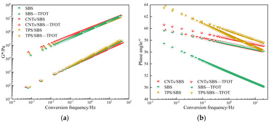 Figure 4a shows that the composite shear modulus of various asphalts gradually increased with increasing loading frequency. With increasing frequency, the loading time became increasingly shorter, material deformation was smaller, and stiffness was greater. The modulus was also higher; thus, the higher the complex shear modulus, the stronger the asphalt resistance to loading. The three asphalts before aging in the high-temperature and low-frequency region were compared. CNT/SBS-HVMA exhibited the largest G*, indicating that it exhibited a stronger resistance to deformation under high temperature and low-speed driving. This is attributable to the large aspect ratio of CNT/SBS-HVMA, which acts as a reinforcement between the asphalt and the modifier, making the asphalt system more stable at high temperatures [32]. In the low-temperature and high-frequency region, the G* main curves of the three high-viscosity asphalts basically overlap and the moduli were similar. TPS/SBS-HVMA exhibited the smallest G*, indicating that the cracking resistance of TPS/SBS-HVMA materials under low-temperature and fast-driving conditions was good. The low-temperature performance was slightly better than those of the other two high-viscosity asphalts.