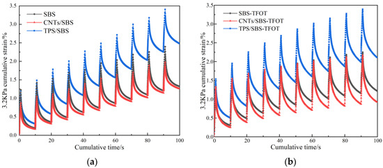 Figure 5 shows the creep recovery curves of the three HVMAs under stress conditions of 0.1 and 3.2 kPa before and after aging. Under different stress conditions, the cumulative strain increased with the loading time. The asphalt strain at a stress of 3.2 kPa was higher than that at a stress of 0.1 kPa. Before and after aging, the strain of TPS/SBS-HVMA was the largest under both stress conditions, and the strain of CNTs/SBS-HVMA was the smallest. This shows that TPS/SBS-HVMA exhibited high asphalt flow deformation, which was unfavorable for the high-temperature rutting resistance of asphalt pavements. Under the low-stress conditions, the strains of TPS/SBS-HVMA and SBS-HVMA after aging were significantly reduced, while the strain of CNTs/SBS-HVMA was more stable. The addition of CNTs/SBS to HVMA reduced the cumulative strain of the modified asphalt and improved its high-temperature deformation resistance, and the improvement effect of the high-temperature deformation resistance under low-stress loading conditions was more prominent.