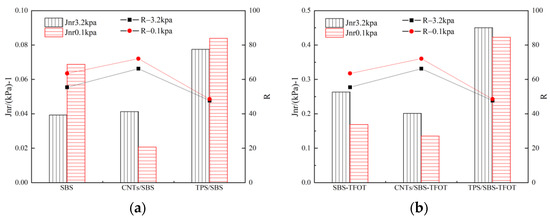 The MSCR test results before and after the aging of the three modified asphalts were analyzed, as shown in Figure 6a,b. R is the strain recovery rate. The higher the R value, the smaller the permanent deformation of the asphalt after stress unloading, and the smaller the possibility of rutting on the road surface. Jnr is the irrecoverable creep compliance. The smaller the Jnr, the smaller the irrecoverable residual strain of the asphalt after stress unloading, indicating that the rutting depth of the pavement was smaller [33]. Under both stress conditions, the strain recovery rate of CNTs/SBS-HVMA before and after aging was higher than those of SBS-HVMA and TPS/SBS-HVMA. The addition of CNTs to asphalt significantly improved the high-temperature rutting resistance of asphalt. The Jn analysis of the three asphalts showed that the Jnr value of the asphalt generally increased with increasing stress, indicating that the shear stress had an effect on the high-temperature deformation resistance of the asphalt. The Jnr values of the three asphalts after aging all increased, indicating that the light components of the asphalt volatilized during the aging process, and the viscous flow ability between the colloids decreased. The Jnr values of CNTs/SBS-HVMA at both strains before and after aging were smaller than those of the other two asphalts, indicating that CNTs functioned as a short fiber reinforcement and anchor between the SBS molecules, increased the bond strength of the asphalt system, and improved its high-temperature rutting resistance.