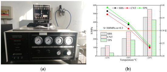 The creep stiffness modulus S and the rate of change m of the stiffness modulus with time were through a bending beam creep test (Figure 7). The greater the stiffness modulus S of the asphalt, the stronger the brittleness of the asphalt, and the higher the susceptibility of the asphalt to cracking and failure. The smaller the S value, the higher the low-temperature flexibility of the asphalt and the higher its low-temperature crack resistance. As the creep rate m of the asphalt increased and the temperature decreased, the shrinkage strain produced by the material reduced the stiffness modulus S of the asphalt, thereby reducing the tensile stress and the possibility of asphalt cracking.
