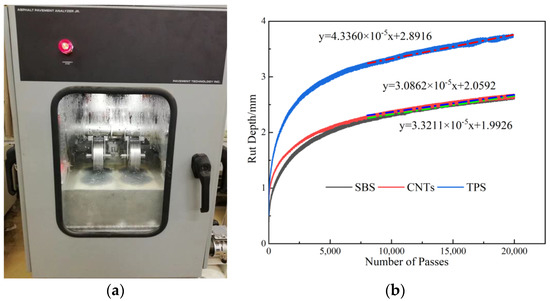 The temperatures of the test chamber and the water bath of the asphalt mixture were both 60 °C, the width of the test wheel was 47 mm, the wheel pressure was 0.7 MPa, and the loading rate was 52 ± 2 passes per minute. The test ended after ≥20,000 wheel rolling passes or when the rut depth was ≥12.5 mm.