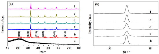 The XRD spectra of different C-LaFeO3 samples (b, 0%; c, 5%; d, 10%; e, 15%; f, 20%) and C are shown in Figure 1a. Among them, a is the preparation of amorphous C nanospheres [], b is pure phase LaFeO3, and c, d, e, and f correspond to C-LaFeO3 samples with different C contents. The results in Figure 1 show that C-LaFeO3 samples with different C contents are consistent with the main diffraction peaks of LaFeO3 and have an orthorhombic perovskite structure. Different C contents do not change the lattice structure of the LaFeO3 samples, and each sample retains the orthorhombic perovskite structure. The enlarged XRD spectra of different C-LaFeO3 samples (b, 0%; c, 5%; d, 10%; e, 15%; f, 20%) are shown in Figure 1b. Compared to b, the diffraction peaks of c, d, e, and f of different C-LaFeO3 samples were reduced, and none of them exhibited diffraction peaks of C. These trends may be due to the low C content and the high dispersion of C in the LaFeO3 lattice that occupies part of its growth site [], which causes LaFeO3 to grow incompletely and the diffraction peak intensities to decrease. Second, in the comparison of the spectra in c, d, e, and f, the diffraction peak of the e sample is sharper, the intensity is higher, and the crystallinity is improved.