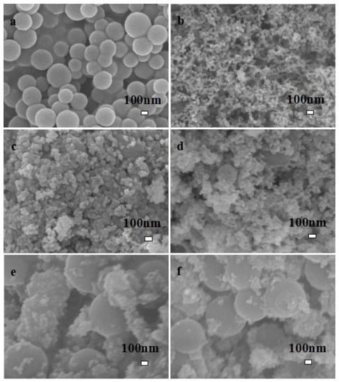 The SEM images of C, LaFeO3, and different C-LaFeO3 samples are shown in Figure 2. Here, a corresponds to the preparation of amorphous carbon nanospheres []; b corresponds to LaFeO3, which shows spherical particles; c, d, e, and f represent different C-LaFeO3 samples with different C contents of 5%, 10%, 15%, and 20%, respectively. As the C content increases, the C spheres in the nanocomposite increase, and LaFeO3 is dispersed on the surface of the C nanospheres.