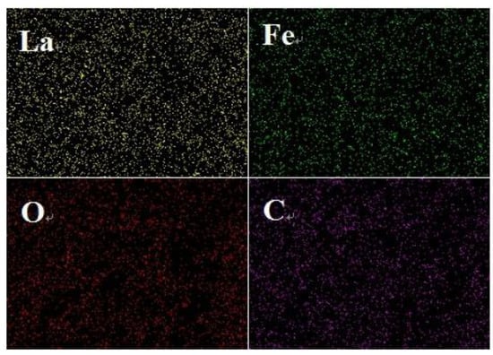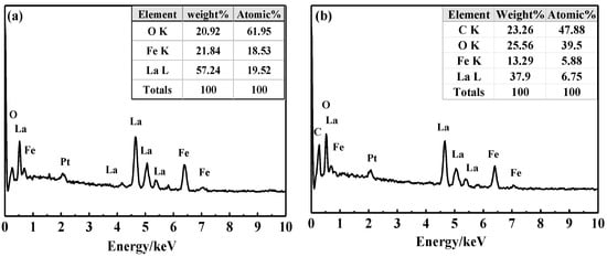 The point and face sweeps of the LaFeO3 in Figure 3a and 15% C-LaFeO3 (b) sample EDS are shown in Figure 3 and Figure 4. Among them, Figure 3a,b correspond to the LaFeO3 and 15% C-LaFeO3 samples, respectively, and the inset displays the weight and content ratio of each sample. From the energy spectrum (EDS) in Figure 3a, the sample contains three elements of La, Fe, and O, and the atomic ratio of La, Fe, and O is 1:1:3, which is consistent with the structure of LaFeO3. The Pt is the result of pretreatment of the sample prior to testing. Comparing the energy spectra (EDS) in Figure 3a,b, in addition to the elements in Figure 3a, there is clearly C in Figure 3b, further indicating the successfully incorporation of C into LaFeO3. From the surface scan of Figure 4, the dispersion of each element is relatively uniform, and the distribution of doped C elements is relatively uniform.