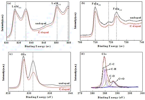 XPS spectra of LaFeO3 and C-doped LaFeO3 samples. (a) La 3d, (b) Fe 2p, (c) O 1 s, and (d) C 1 s.