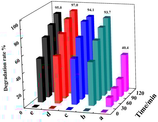 The photocatalytic activity of different C-LaFeO3 samples (a, 0%; b:, 5%; c, 10%; d, 15%; e, 20%) for the degradation of 5 mg·L−1 MB under visible light is shown in Figure 6. According to the figure, the photocatalytic degradation ability of MB of C-LaFeO3 samples b, c, d, and e is different, but they are all larger than that of a. To some extent, there is a strong interaction between C and LaFeO3 such that the photogenerated carriers rapidly migrate to the surface of LaFeO3, resulting in efficient electron–hole separation and improved photocatalytic performance. Comparing the photocatalytic effects of different C-LaFeO3 samples, when the C content is 15%, the efficiency of photocatalytic degradation of MB is 97.0%, and the photocatalytic activity reaches its maximum value. This finding indicates that an appropriate amount of C is critical for the enhancement of the photocatalytic activity of LaFeO3. When the C doping content is small, fewer O vacancies generated by the action of C and LaFeO3 enhance the absorption of visible light by the LaFeO3 catalyst and improve its photocatalytic activity. When the C doping content is high, the excess O vacancies form an electron–hole recombination center, which decreases the photocatalytic activity of LaFeO3 [].