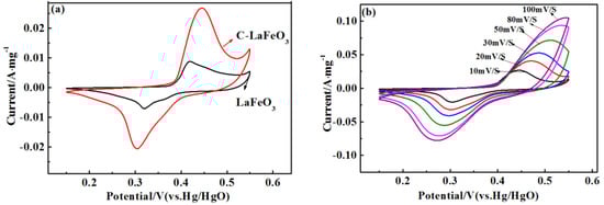 (a) CV curves of different C-LaFeO3 samples; (b) CV curve of 15% C-LaFeO3 sample at different scan rates.