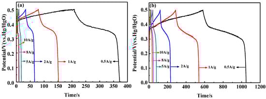 For measurements, Hg/HgO (1 M KOH was internal reference solution) together with Pt foil were used as the reference and counter electrodes, respectively, in the KOH (6 M) aqueous electrolyte solution. The CV and EIS tests were conducted using a CHI604D Electrochemical Analyzer (Chenhua, Shanghai, China). Cyclic voltammetry (CV) curves were recorded from 0.15 V to 0.55 V at scan rates from 10 mV·s−1 to 100 mV·s−1. Galvanostatic charge and discharge (GCD) curves were recorded from 0.15 V to 0.55 V at current densities from 0.5 A/g to 10 A/g. Electrochemical impedance spectroscopy (EIS) was measured at open circuit potential with a 5 mV amplitude in the frequency range of 100 kHz to 0.01 Hz.